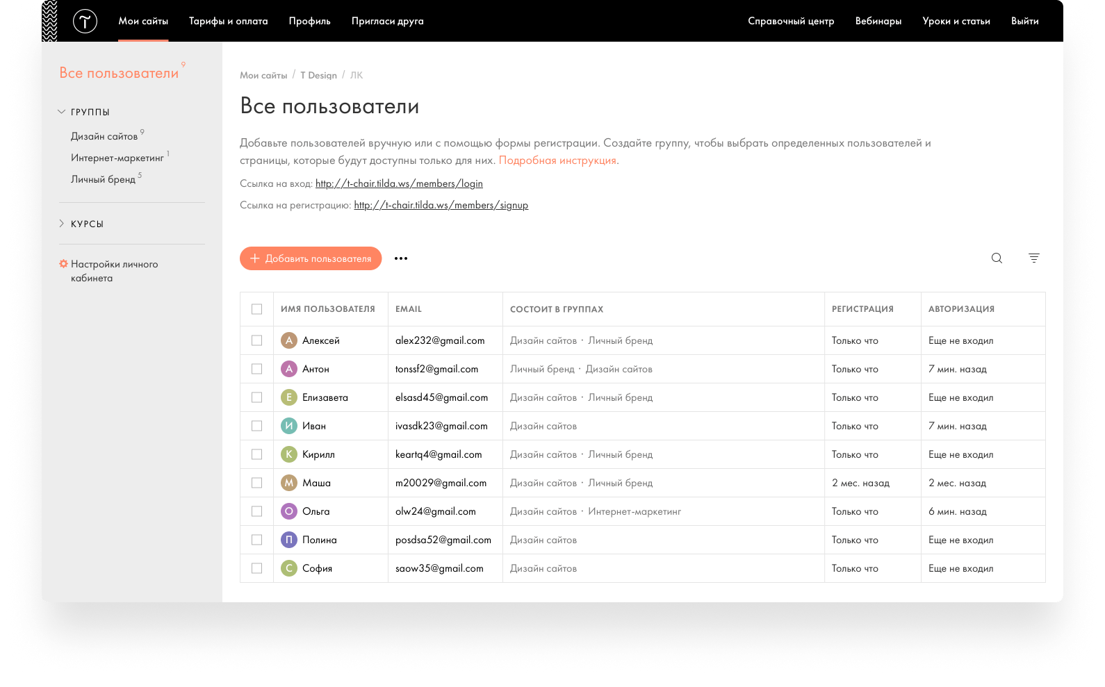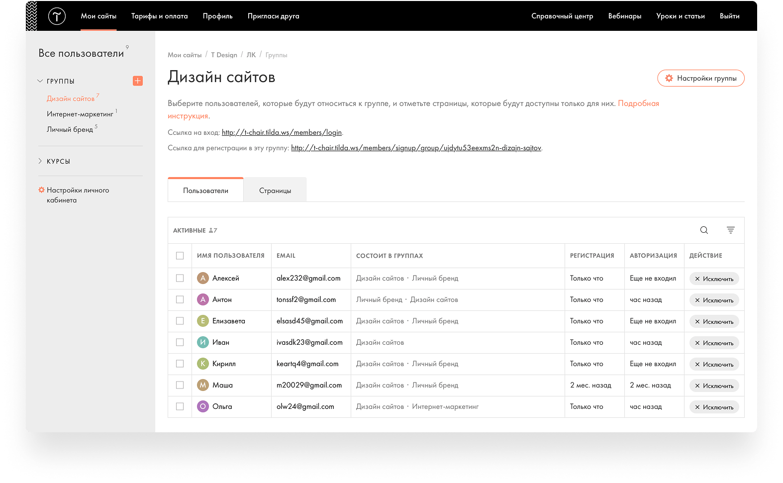 Чтобы пользователи увидели онлайн-курс, создайте группу доступа и откройте для ее участников нужные страницы. Они будут доступны только через личный кабинет