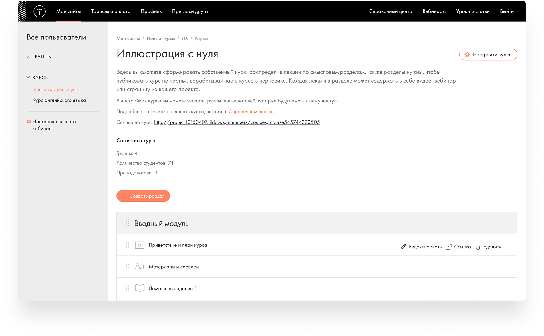 Создавайте курсы с разным набором модулей и лекций. На одном аккаунте можно создать несколько курсов.