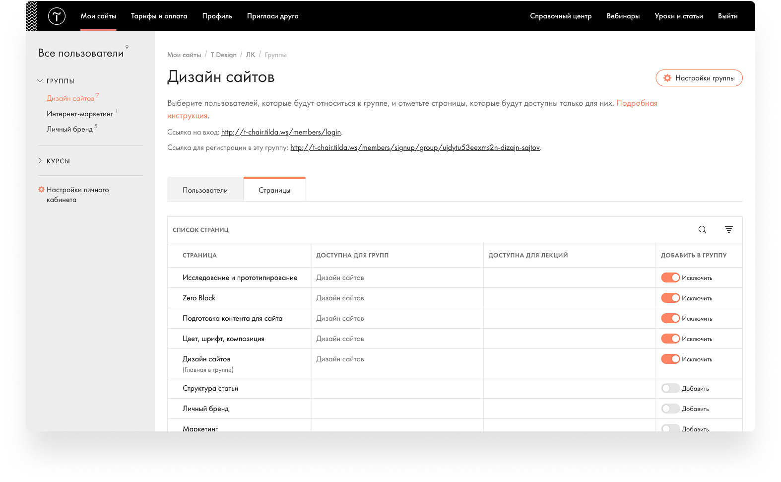 Чтобы пользователи увидели онлайн-курс, создайте группу доступа и откройте для ее участников нужные страницы. Они будут доступны только через личный кабинет