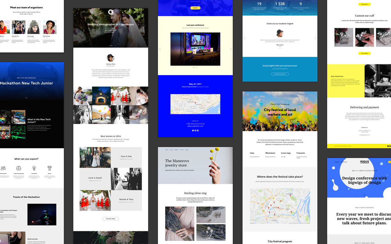 В основе Тильды — модульный редактор. Создание сайта похоже на игру — выберите из библиотеки более 550 готовых блоков в 29-ти категориях. Достаточно добавить несколько блоков, заменить в них контент и сразу опубликовать собственный проект.